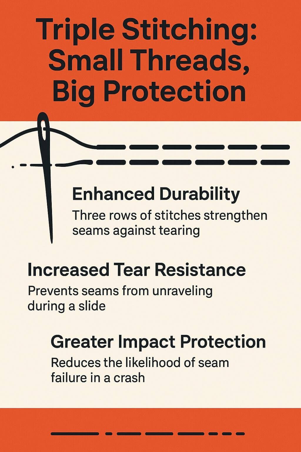 Armor and leather mean nothing if the seams fail. During impact, seams face massive stress. That’s why triple stitching is essential for high-performance suits.